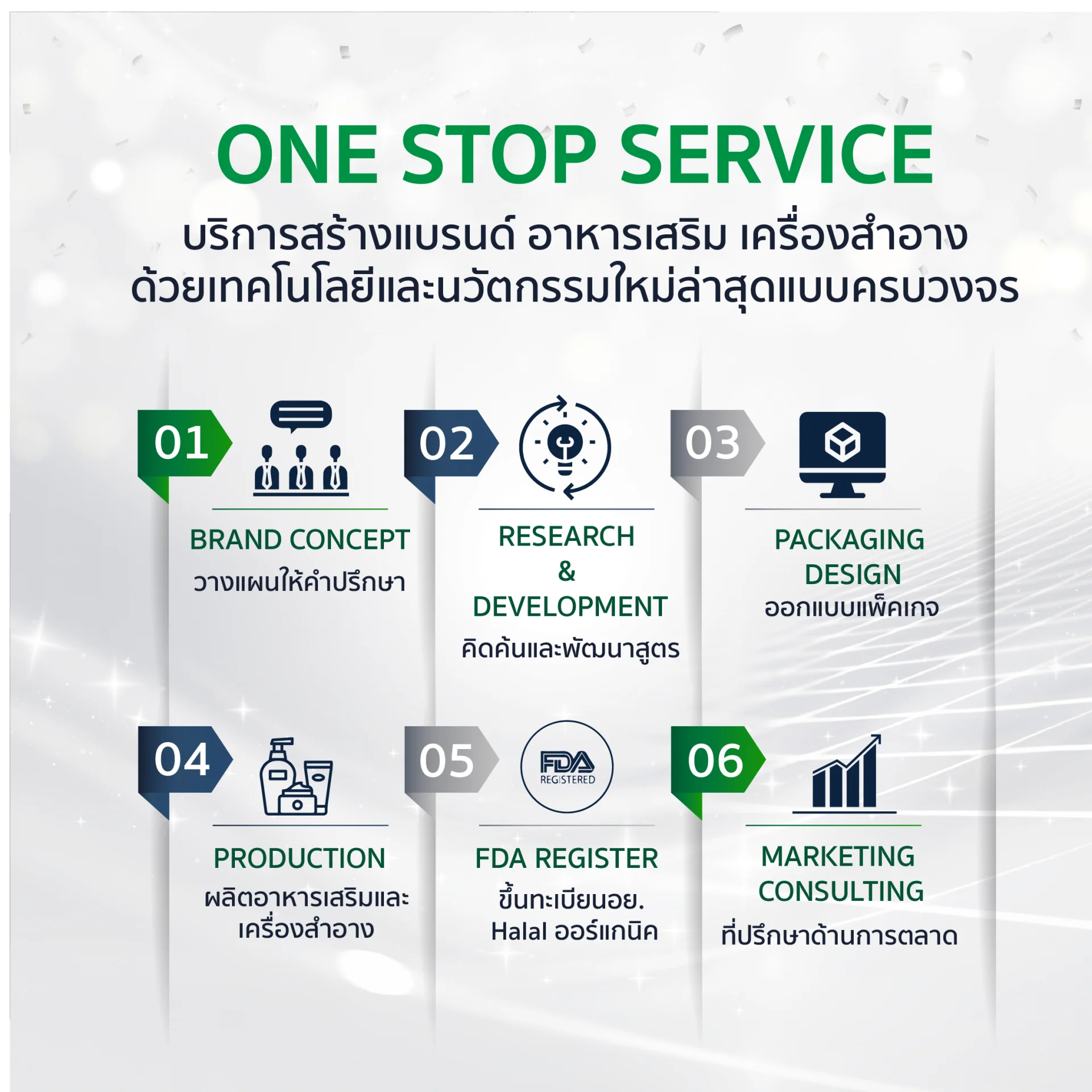 คำปรึกษาด้านการสร้างแบรนด์อาหารเสริม และเครื่องสำอาง การวางแผนธุรกิจ และการเตรียมช่องทางการตลาด และช่องทางการจัดจำหน่าย รวมถึงการวางแผนงบประมาณโฆษณาครบวงจร