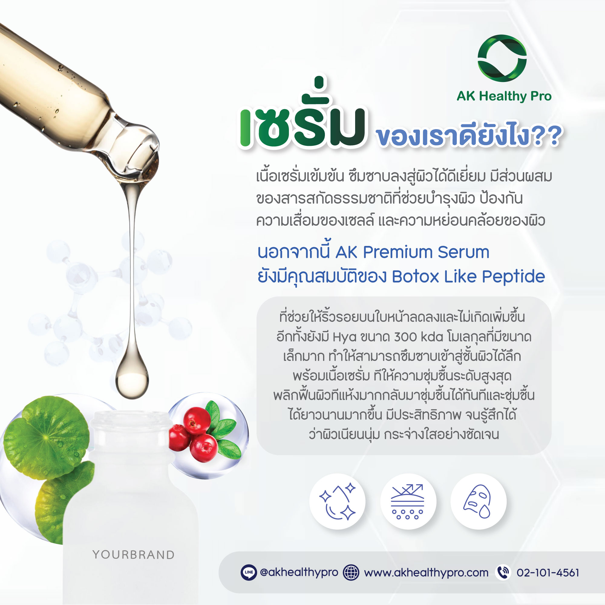 เนื้อเซรั่มเข้มข้น ซึมซาบลงสู่ผิวได้ดีเยี่ยม มีส่วนผสมของสารสกัดธรรมชาติที่ช่วยบำรุงผิว ป้องกันความเสื่อมของเซลล์ และความหย่อนคล้อยของผิว นอกจากนี้ AK Premium Serum ยังมีคุณสมบัติของ Botox Like Peptide ที่ช่วยให้ริ้วรอยบนใบหน้าลดลงและไม่เกิดเพิ่มขึ้น อีกทั้งยังมี Hya ขนาด 300 kda โมเลกุลที่มีขนาดเล็กมาก ทำให้สามารถซึมซาบเข้าสู่ชั้นผิวได้ลึก พร้อมเนื้อเซรั่ม ทีให้ความชุ่มชื้นระดับสูงสุด พลิกฟื้นผิวทีแห้งมากกลับมาชุ่มชื้นได้ทันทีและชุ่มชื้นได้ยาวนานมากขึ้น มีประสิทธิภาพ จนรู้สึกได้ ว่าผิวเนียนนุ่ม กระจ่างใสอย่างชัดเจน